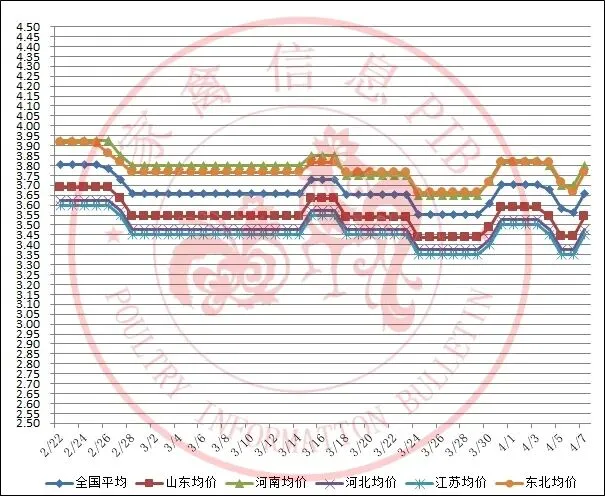 2026年2月22日-2026年4月7日主流地区白羽鸡毛鸡均价走势图