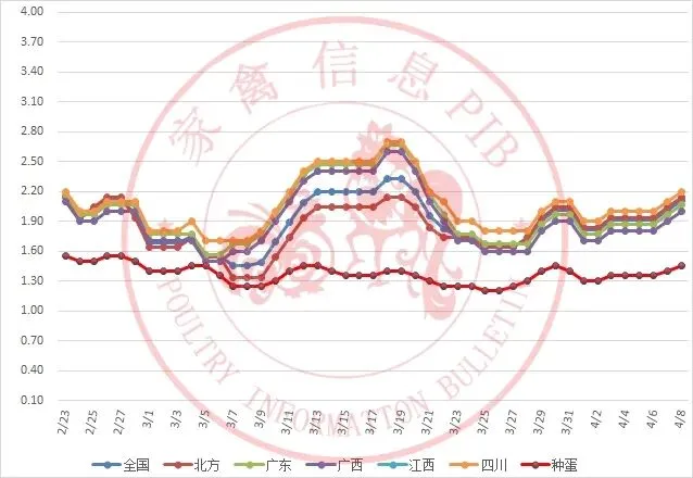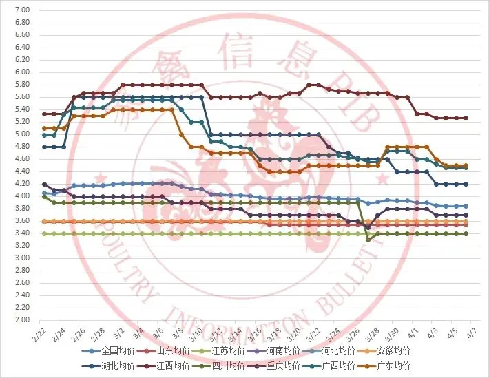 2026年2月22日-2026年4月7日主流地区白羽鸭毛鸭均价走势图