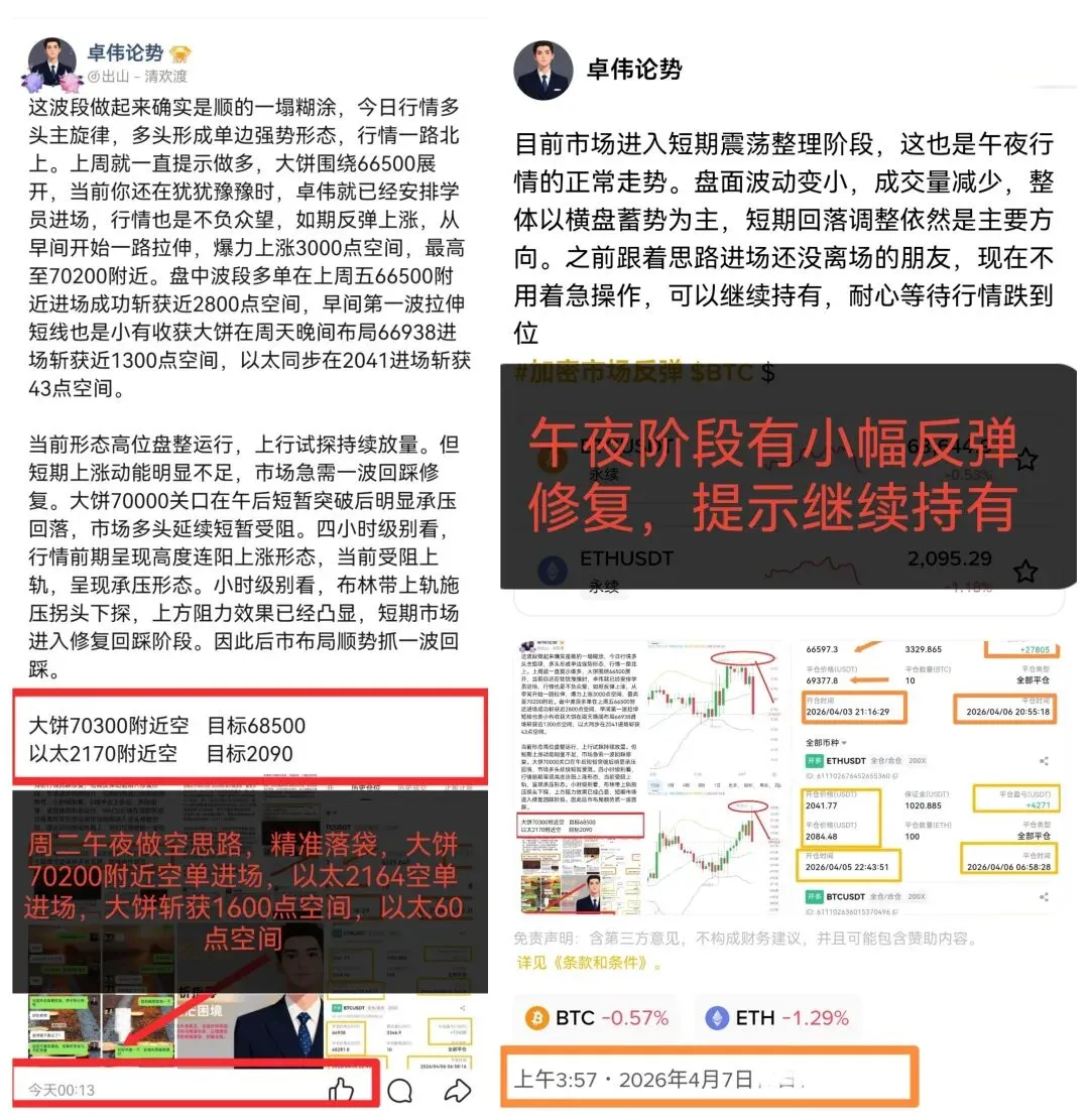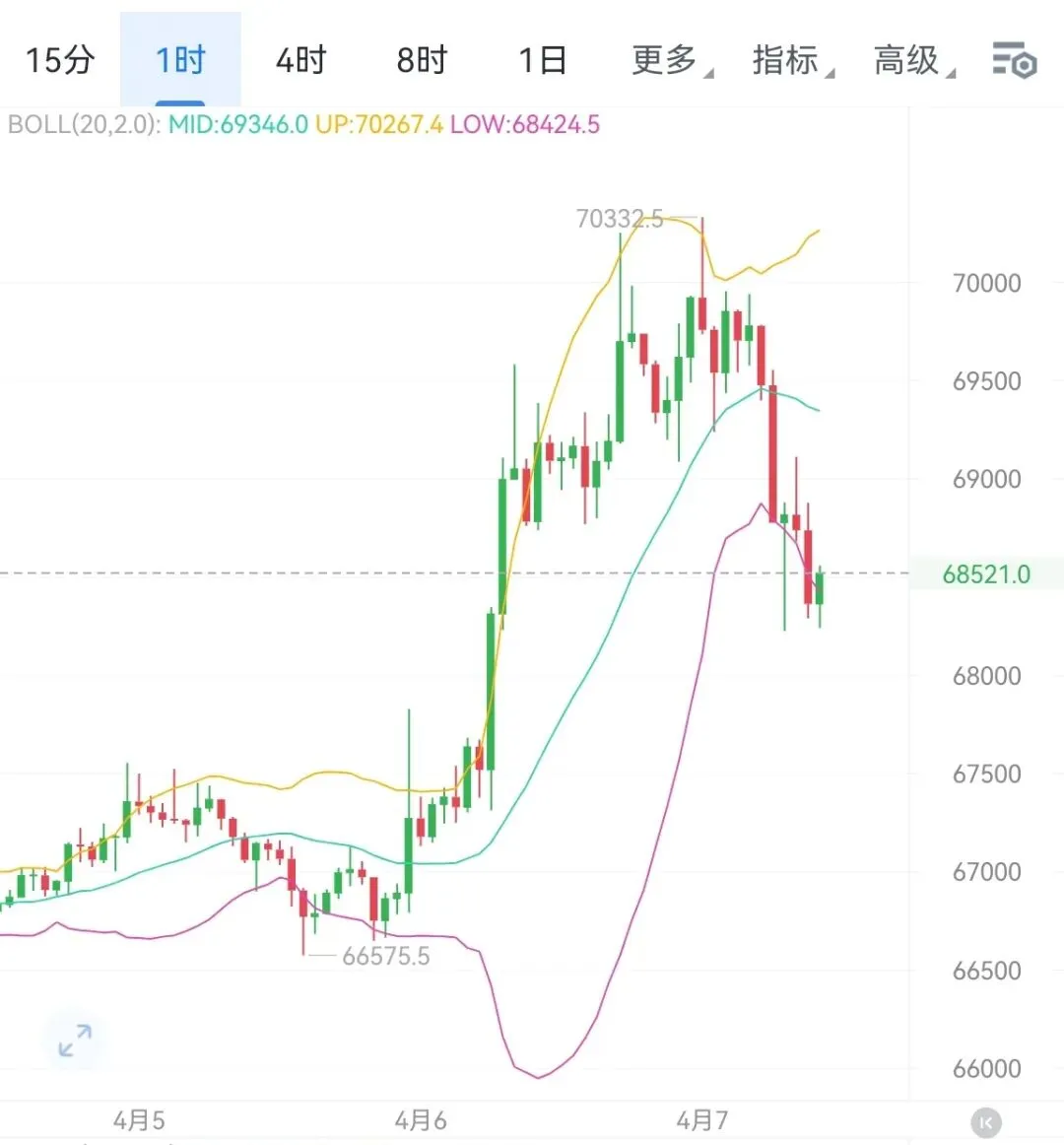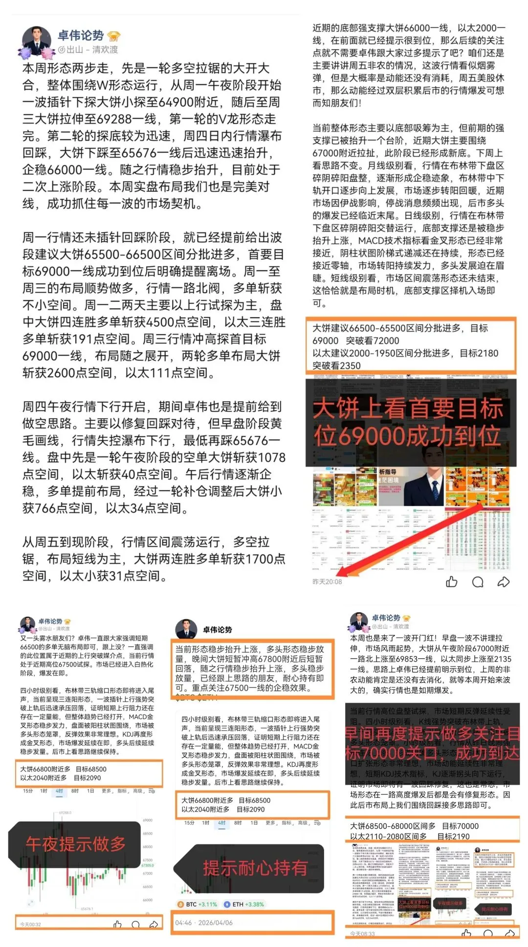 这形态运行的就非常的舒服,先拉伸后砸盘。从周一开始行情一路飙升上涨,大饼直接强拉近3000点空间,在今日午夜开始阶段最高上涨至70300一线,以太同步上涨至高点2174一线。随后高位承压回落,空头量能再度放量,大饼在今日早间最低回落至68200附近。这种运行形态跟上卓伟思路的朋友不就直接起飞了?先一轮的拉伸,在底部66500附近支撑区就一直跟大家强调,行情到达7字关口更是提醒大家抓紧离场。昨日晚间行情反弹承压还未开始卓伟思路再度提示抓空,午夜阶段更是精准给到下行点位,实力高度到位,就看朋友们有没有跟上了!