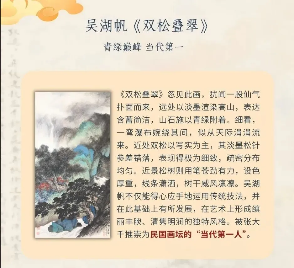 这幅画是吴湖帆为庆祝中华人民共和国建国十周年而参加上海美展的作品,是其青绿山水的巅峰代表作。