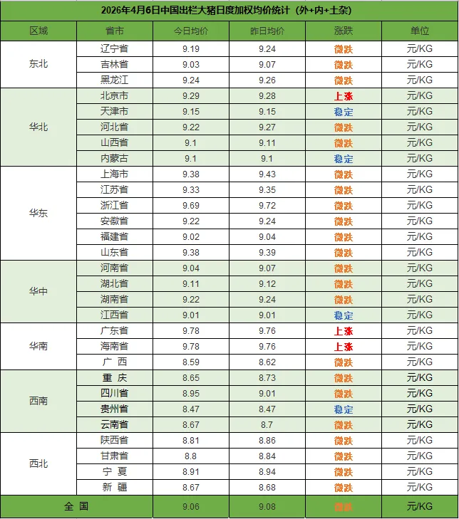 2026年4月6日,中国主流市场出栏外三元、内三元及土杂商品大猪加权日均价较昨日价格下跌,全国生猪出栏加权日均价9.06每公斤,较昨日价格下跌0.28%。当前市场仍处于供应过剩、消费淡季的状态,猪粮比持续偏低,养殖端深度亏损,养殖端抗价与屠宰端压价形成僵持,短期猪价难有大幅反转,整体以低位震荡磨底为主。今日全国外三元、内三元及土杂猪均价如下:1) 主流市场外三元大猪全国销售均9.17元每公斤,较昨天价格下跌0.20%;2)主流市场内三元大猪全国销售均价8.77元每公斤,较昨天价格下跌0.57%;3)主流市场土杂大猪全国销售均价8.40元每公斤,较昨天价格下跌0.23%。