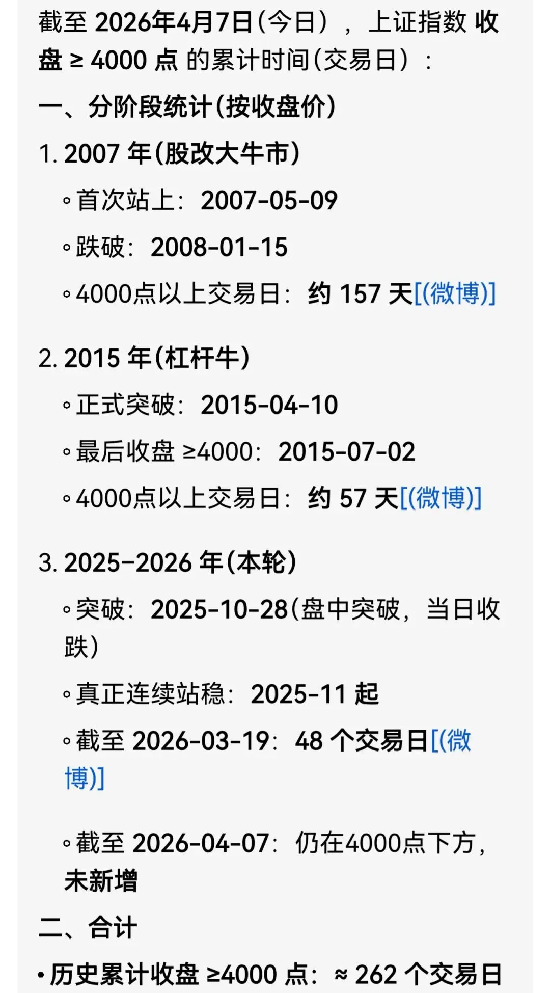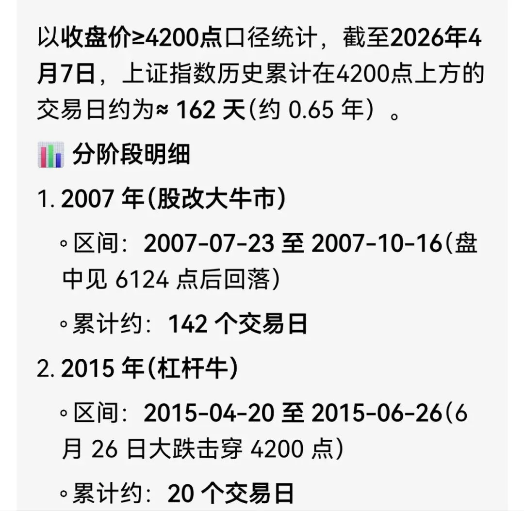 还有一个数据能更好佐证,那就是上证指数历史上站上4000点、4200点的时间很短,差不多就是260天、160天的样子,按照A股35年近8500个交易日,A股站上4000点和4200点的时间其实不足3%和2%的!