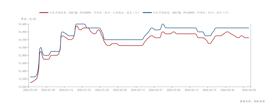 浙江市场作为国内不锈钢消费、流通的核心区域之一,兼具产业集群密集、终端需求多元、贸易流通活跃的特点。进入2026年一季度以来,浙江不锈钢市场整体呈现窄幅震荡、刚需主导、区域分化的格局,市场情绪偏谨慎,成交多以按需采购为主。以杭州市场为例,截至4月初,不锈钢304冷轧主流基价报至13950-14200元/吨,较3月初回落100-150元/吨,但成本支撑下方空间有限。