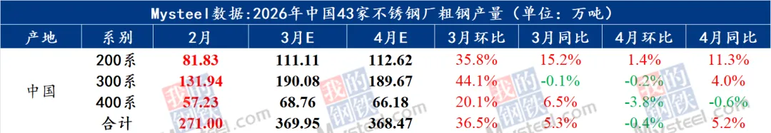 供应端,据Mysteel调研统计,2026年3月国内43家不锈钢厂粗钢预估产量369.95万吨,月环比增加98.95万吨,增幅36.51%,同比增加5.34%。另外,4月排产预计368.47万吨,月环比减少0.4%,同比增加5.2%,4月排产环比虽有小幅下降,但整体供应量仍维持高位,供应压力仍存。
