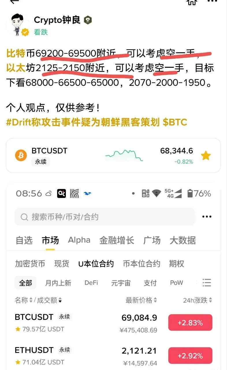 中东局势不稳,一会和谈协议,一会最后通牒的,行情来回震荡,只能跑跑短线,无法格局。昨天公开刚到的比特币69500附近空,以太坊2150附近空,也都能小吃一口肉,索然无趣…
