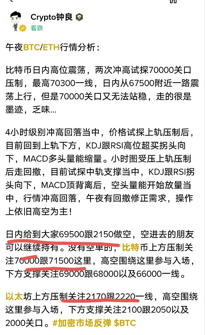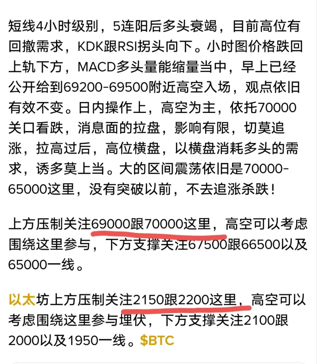 上方压制关注69500到70500这里,关注70000关口压制,依托这里高空一次,下方支撑关注68500跟67000以及65500一线。