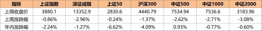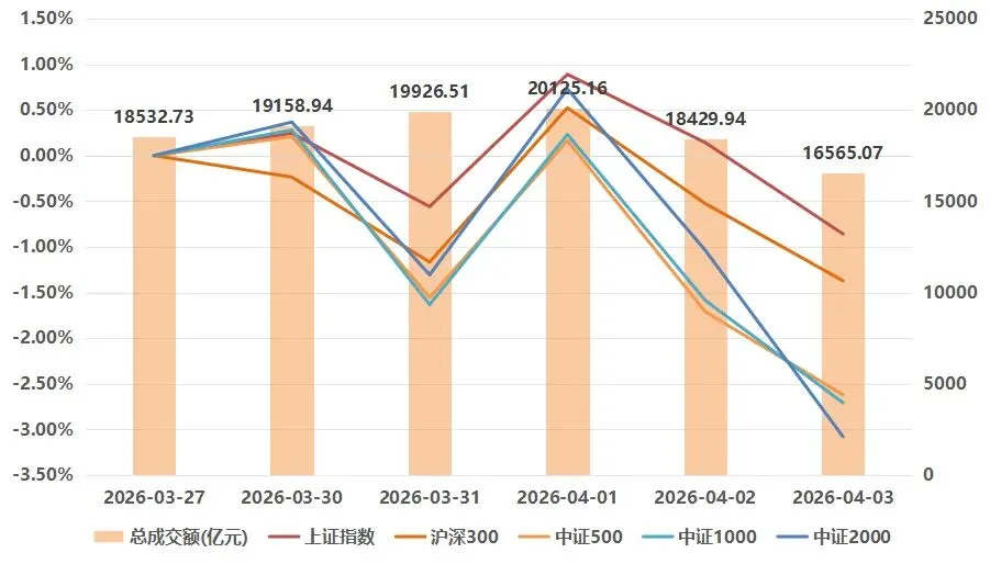 过去一周 (03/30-04/03),上证指数收盘价 3880.10,累计下跌0.86%;深证成指收盘价 13352.90,累计下跌2.96%。上证50 累计下跌 0.24%;沪深300 累计下跌 1.37%;中证500 累计下跌 2.62%;中证1000 累计下跌 2.71%;中证2000 累计下跌 3.08%。全A股日均成交量 18,841.12 亿元,较上上周减少 10.20%。