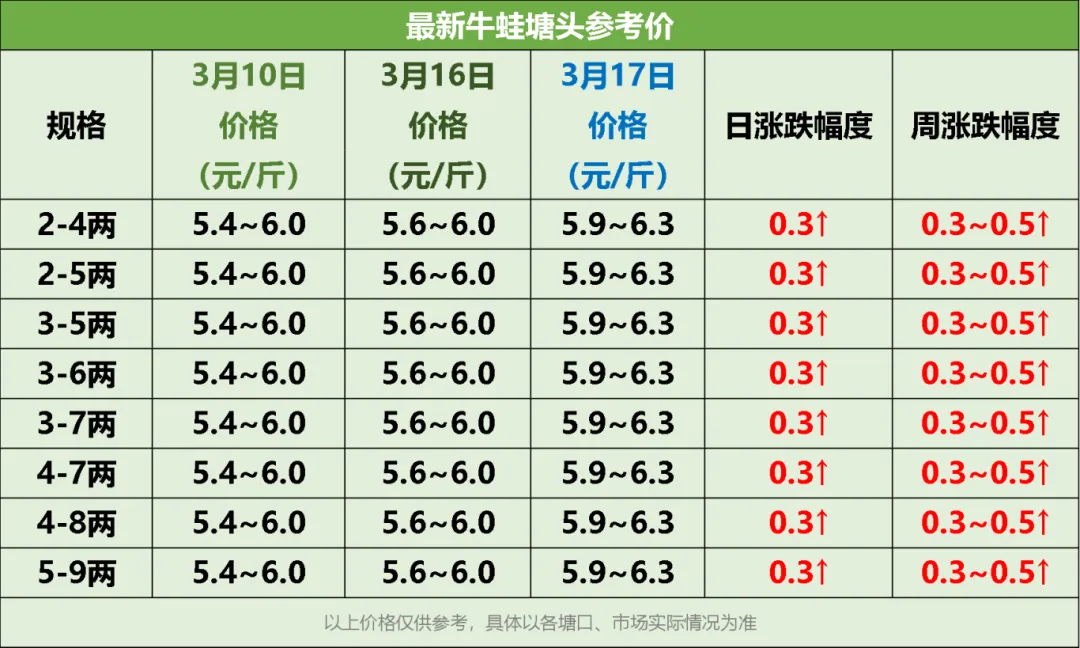 过去一周,蛙价回涨0.3元/斤!根据3月16日各大主流厂家最新报价:2-4两规格牛蛙为5.9~6.3元/斤;2-5两规格牛蛙为5.9~6.3元/斤;3-5两规格牛蛙为5.9~6.3元/斤;3-6两规格牛蛙为5.9~6.3元/斤;3-7两规格牛蛙为5.9~6.3元/斤;4-7两规格牛蛙为5.9~6.3元/斤;4-8两规格牛蛙为5.9~6.3元/斤;5-9两以上规格牛蛙为5.9~6.3元/斤。