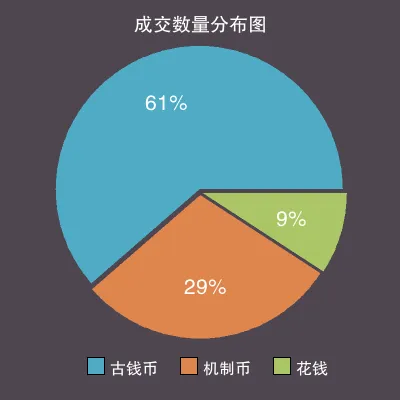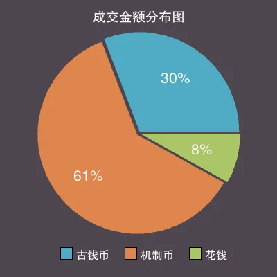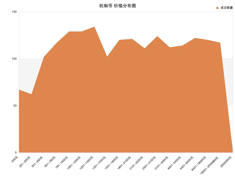 在机制币部分中,上周最低成交价为 200 元,最高价为 2950000 元;依据总成交量,平均价格为 8064 元,但交易中最多的价格区间为 1201-1350元 内的藏品,价格中位数为 1800 元,依据上周的最低价与最高价,低、中、高档藏品的价格分界分别为 1000 元、 1800 元、 4000 元。