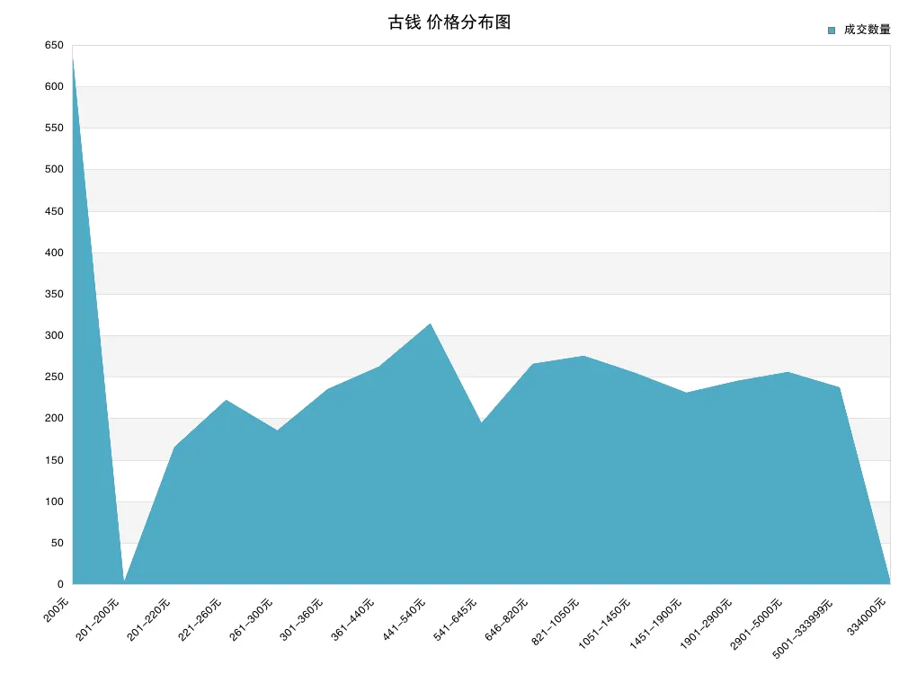 在古钱部分中,上周最低成交价为 200 元,最高价为 334000 元;依据总成交量,平均价格为 1942 元,但交易中最多的价格区间为 200元 内的藏品,价格中位数为 540 元,依据上周的最低价与最高价,低、中、高档藏品的价格分界分别为 260 元、 540 元、 1450 元。