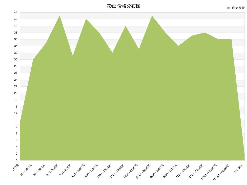 在花钱部分中,上周最低成交价为 200 元,最高价为 71000 元;依据总成交量,平均价格为 3431 元,但交易中最多的价格区间为 521-700元 内的藏品,价格中位数为 1850 元,依据上周的最低价与最高价,低、中、高档藏品的价格分界分别为 825 元、 1850 元、 3700 元。