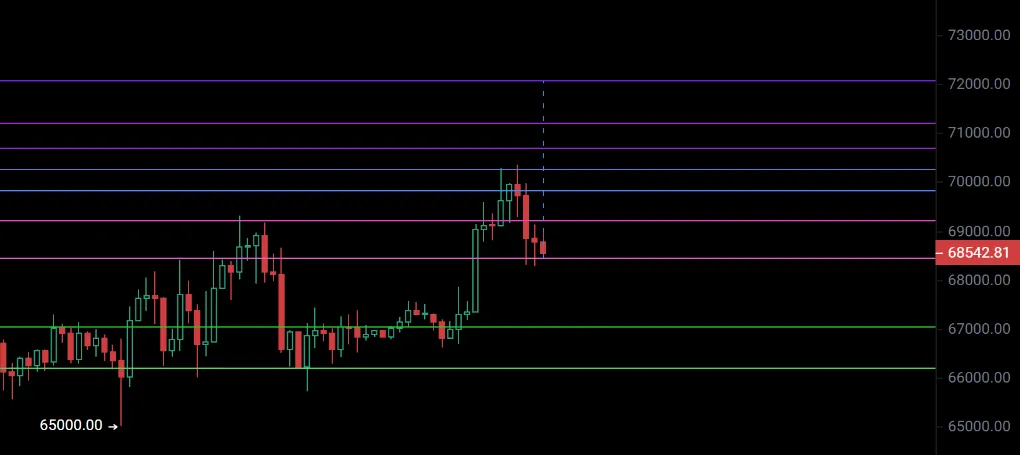 从结构上看,BTC日线的反弹框架还没破,只是4小时节奏有点走弱。日内重点看68200-67500这段支撑,只要回踩不破,日线这波反弹逻辑还在。如果后面4小时能重新站上69000,那说明短线有修复的迹象,可以考虑顺势跟一波多单,上方先看70400-71500这一带。至于空单,还是等到71500附近再考虑更稳一些。