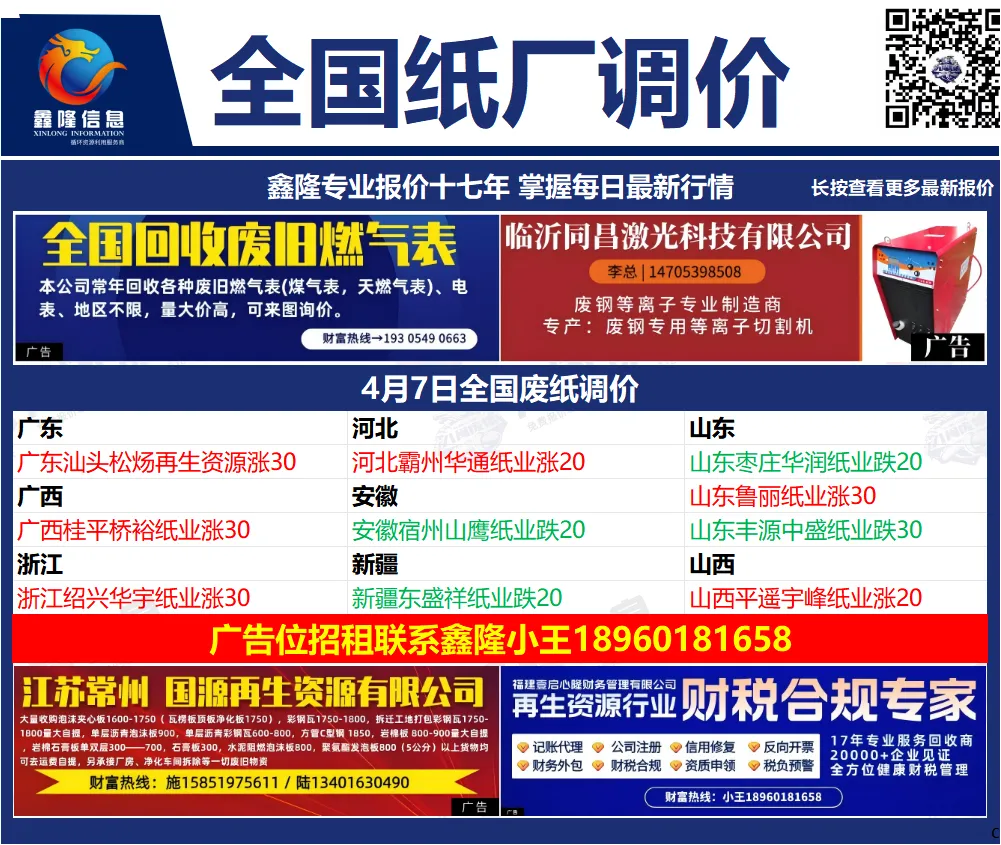 【鑫隆资讯】4月7日河北霸州华通纸业涨20元调整后价格如下:A级1500元/吨B级1450元/吨C级1280元/吨