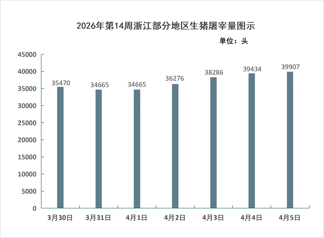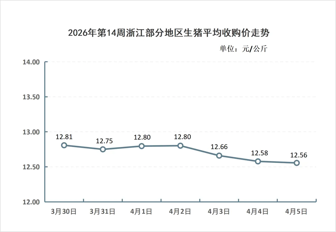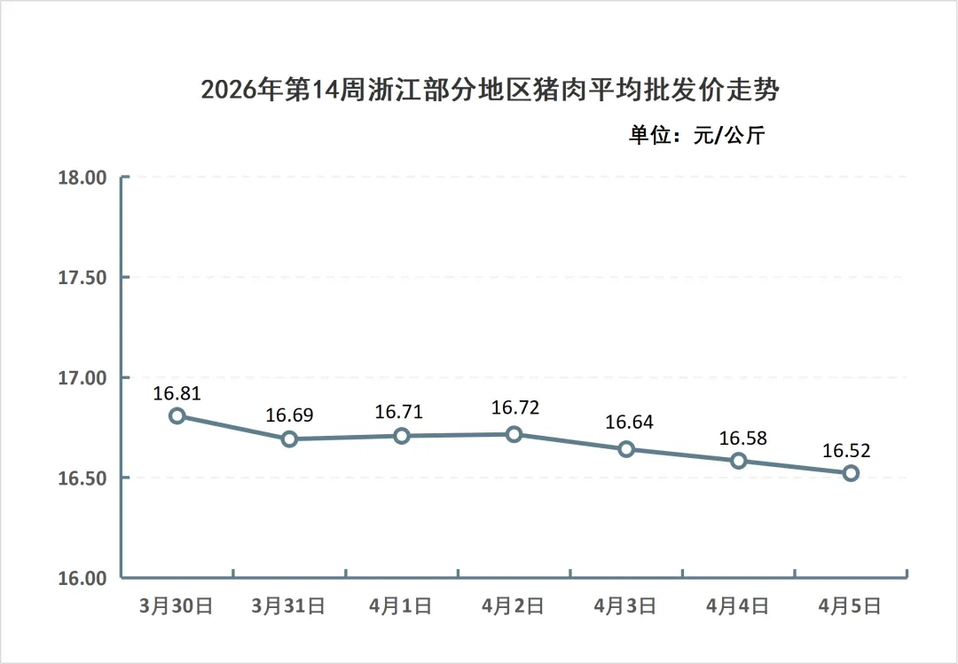据浙江放心肉商情网对全省80家屠宰厂(场)日报监测统计,2026年第14周(3月30日-4月5日),全省生猪屠宰上市量25.87万头,生猪平均收购价为12.71元/公斤,猪肉平均批发价为16.67元/公斤。