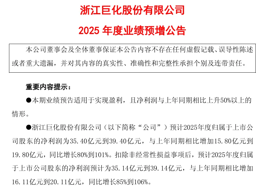 但戈色姆斯注意到一个很有意思的数据:2025年1月22日,巨化股份发布业绩预告,预计全年归母净利润35.40亿至39.40亿元,同比增长80%至101%。