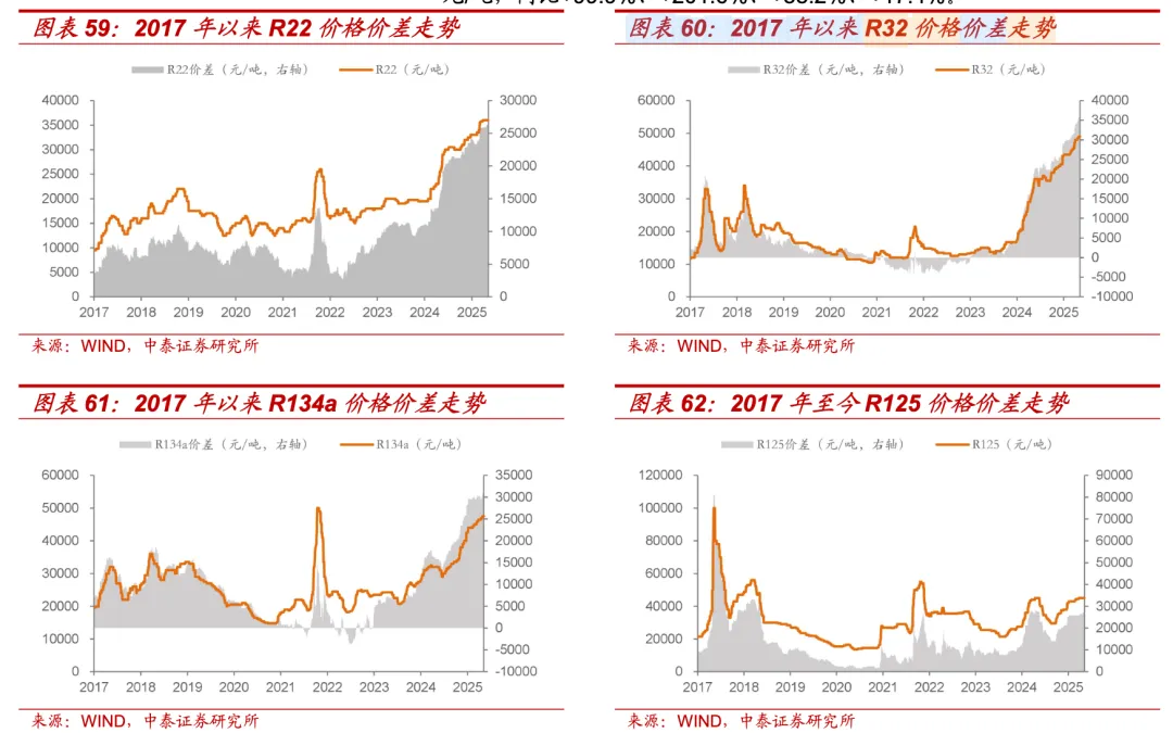 R32从年初2.57万元/吨涨到年底3.90万元/吨,涨幅52%;R125从1.99万元/吨涨到3.55万元/吨,涨幅78%。