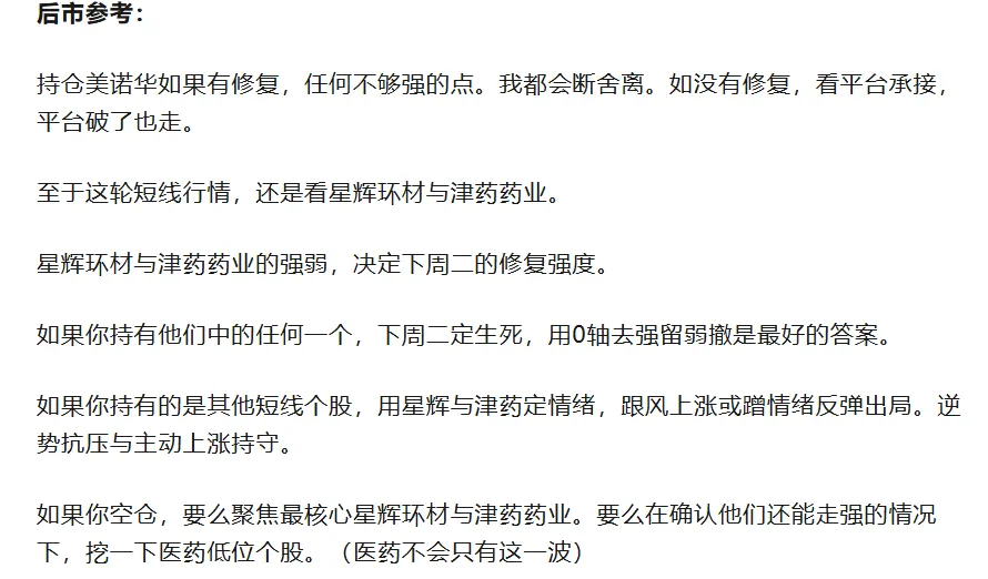 回顾上个交易日短线行情,短线核心星辉环材炸板回落,使得短线情绪走得分化,算是一个小分歧。我们虽持有美诺华做T回落,但也没有悲观。上周五尾盘还拿了星辉环材。9点25分竞价,我们可以看到的是津药药业没有封单,溢价4.7%。对比昨日依然没有加强。而至今说过的法尔胜绕异动的,直接涨停开(这是今日最明显的多头信号)。9点30分开盘,津药药业直接冲击涨停封板。美诺华作为协同个股一起冲高,在冲不动的位置就可以按盘前计划开始减仓。9点33分,津药药业炸板,美诺华回落均线站不稳,进一步减仓锁定利润。在津药药业回落期间,我们可以看到星辉环材与他的分时是PK关系。最终是星辉环材被KO,所以星辉出局。整体盘面,属于分歧中前行。津药药业封板不算晚,但换手率来到近期最大。明日依然需要接受考验。星辉环材没有强表态,只有维稳力度没有进攻力度。当下津药药业已经成为本轮最靓的仔,除了法尔胜属于独立行情,其他短线个股都要受其影响。如果你持仓津药,那你只需要盯紧持仓,外面的一切与你关系不大,用0轴做生死线,去做强留弱撤。如果你持仓其他短线个股,津药的强度就是你判断情绪的关键。当津药强时你的持仓股能不能跟上做协同,当津药你的持仓股能否逆势做承接。用这两点做好去弱留强。如果你空仓,津药的博弈依然是第一选项,但这里属于高风偏人群。保守一点,可以看美诺转债。T+0日内就可以结算。美诺华。收盘看到鑫多多进场,这个柚子是有可能成为2025年的陈小群。明日可以看看有没有席位溢价。(去年的国晟,今年的法尔胜。)国晟科技 合富中国 中利集团 津药药业 美诺华 法尔胜 新能泰山 舒华体育 诺德股份 万邦德 通鼎互联 鹭燕医药 中油资本 大东南 翠微股份 金风科技 华电辽能 中安科 通宇通讯 通达股份 汇源通信 圣阳股份 航锦科技 平潭发展 雪人集团 新中港 奥瑞德 圣泉集团 长飞光纤 双鹭药业 顺灏股份 金牛化工 东方新能 济民健康 大胜达 金陵体育 神剑股份 深圳华强 华盛昌 包钢股份 粤传媒 亨通光电 再升科技 云赛智联 赤天化 中工国际 东岳硅材 协鑫能科 天银机电 重药控股 福晶科技 中体产业 南京商旅 航天电器 金正大 协鑫集成 江南高纤 寒武纪 节能风电 华统股份 华胜天成 恩捷股份 航天发展 北方稀土 美利云 华脉科技 海王生物 中超控股 柏诚股份 新安股份