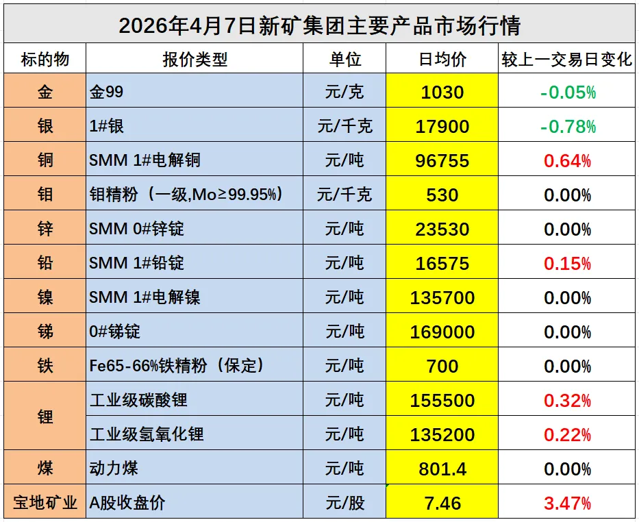今日行情 | 2026年4月7日新矿集团主要产品市场行情