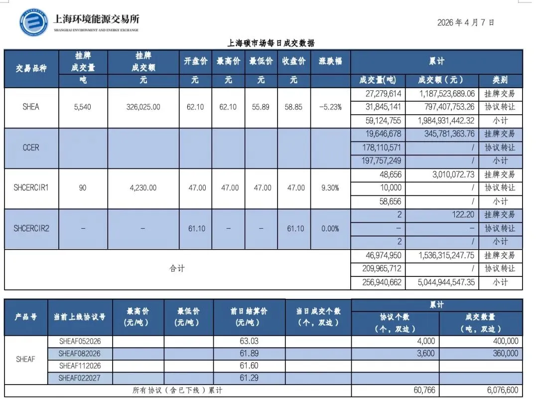 截至今日,上海碳市场所有现货品种累计成交量256,940,662吨,累计成交金额5,044,944,547.35元。其中,配额累计成交59,124,755吨,成交金额1,984,931,442.32元;CCER累计成交197,757,249吨;SHCERCIR1累计成交58,656吨;SHCERCIR2累计成交2吨。上海碳配额远期产品累计成交数量6,076,600吨。