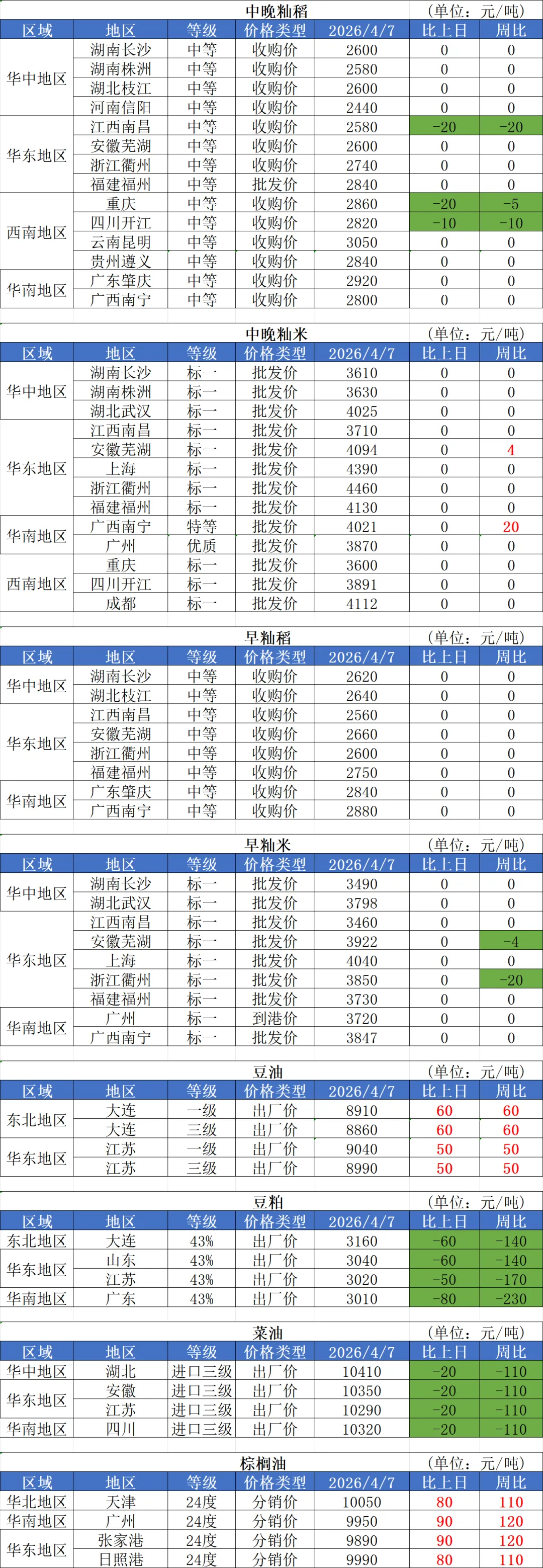 3、4月7日,最低收购价稻谷计划销售601062吨,实际成交79004吨,成交率为13.14%。最高成交价2695元/吨,最低成交价2555元/吨,成交均价2629.7元/吨。