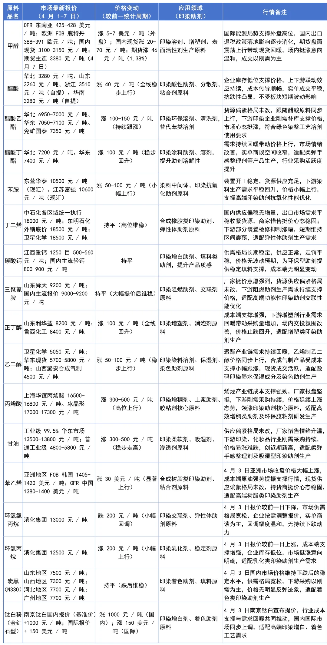 2026 年 4 月 1-7 日,纺织印染助剂行业上游核心化工原料市场呈现成本支撑强化、涨跌分化延续的运行特征。国际原油价格震荡上行传导至化工板块,叠加国内部分装置动态调整与出口退税政策落地影响,苯乙烯、醋酸系、丙烯酸等品种延续涨势,炭黑、环氧氯丙烷等维持回调态势,丁二烯、三聚氰胺等高位维稳,行业供需格局的结构性差异进一步凸显。行情核心特征
