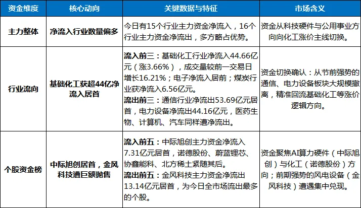 今日资金面呈现清晰的“弃通信、追化工”特征,主力资金从通信、电力设备等板块大规模撤离,大幅涌入基础化工、电子、煤炭等方向。