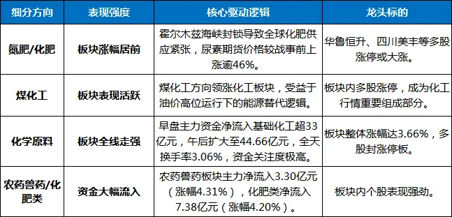 化工板块成为今日绝对王者,驱动逻辑来自尿素等产品涨价+春耕需求+中东局势推升化肥供应风险的多重共振。