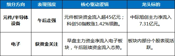 ○中期布局:保持对半导体/元件、AI算力等科技主线的关注。元件板块资金流入超45亿,科创50领跑,显示资金对科技成长方向仍保持关注。
