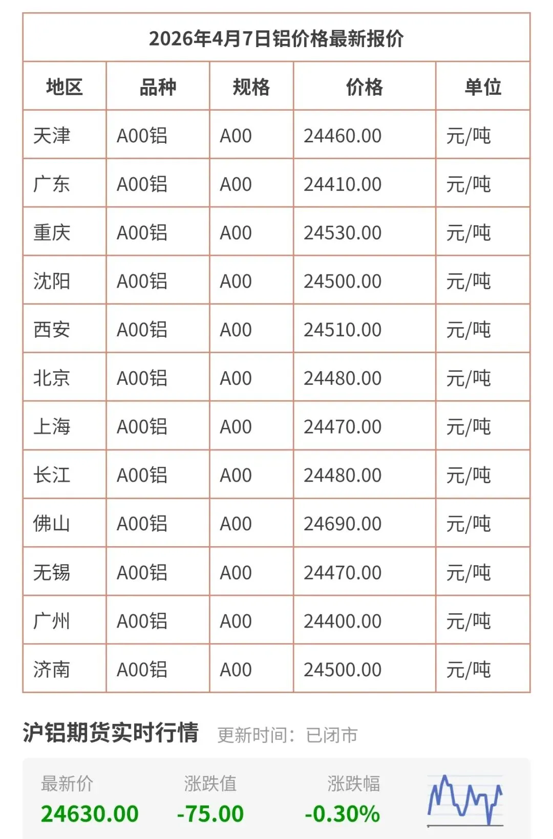今天4月7日更新,今日铝价行情查询,包括天津、广州、上海、北京、无锡、广东、佛山等地区铝现货价格!长江有色铝锭最新价格是多少钱一公斤一览表