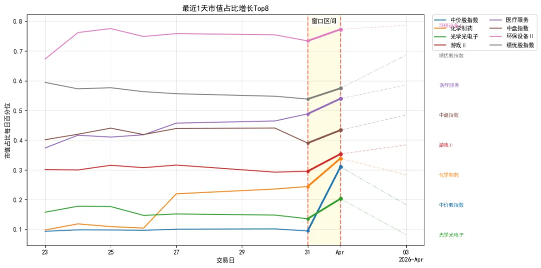 中价股指数、化学制药、光学光电子、游戏Ⅱ、医疗服务、中盘指数、环保设备Ⅱ、绩优股指数