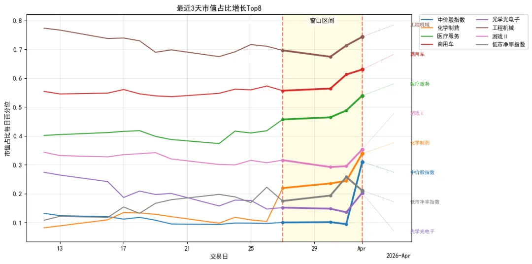 中价股指数、化学制药、医疗服务、商用车、光学光电子、工程机械、游戏Ⅱ、低市净率指数