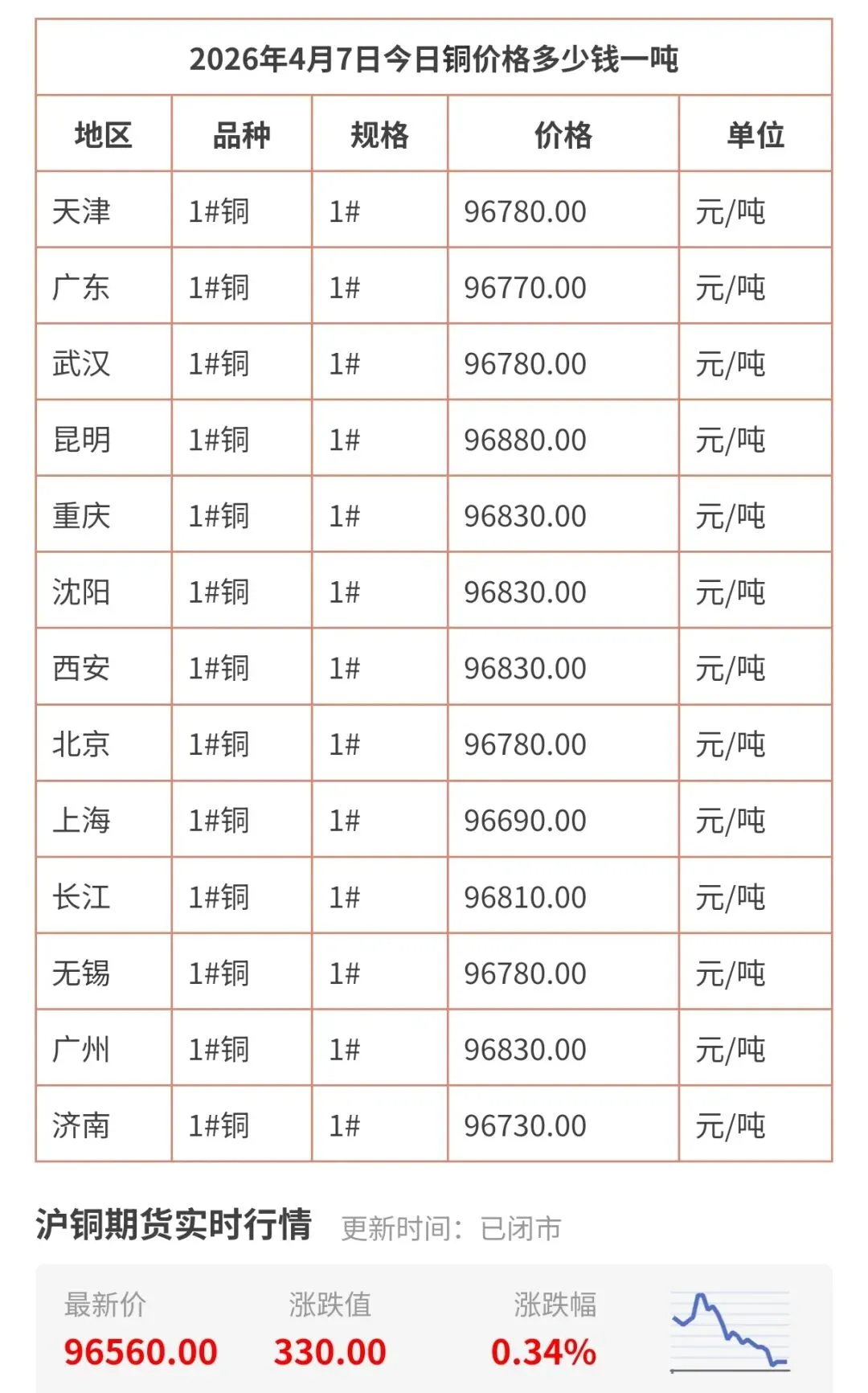 4月7日更新,今天铜价实时查询!最新今日铜价格多少钱一吨,包括广东、武汉、昆明、西安、无锡、天津等地区现货铜价格