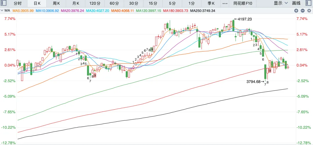 而创业板指数和深证成指今天也是报收十字星,连续三天没能重新收复半年线。