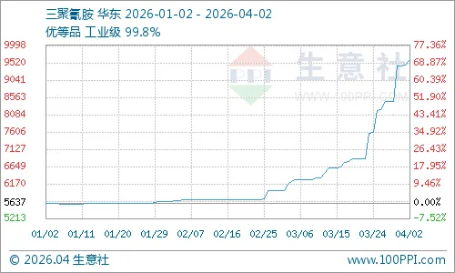 刚刚过去的一周,三聚氰胺市场呈现价格高位维稳、成交逐步放缓的特征。据生意社数据显示,4月2日三聚氰胺价格达到9600元/吨,延续前期强势上涨趋势后进入阶段性企稳阶段。从价格曲线来看,3月中下旬三聚氰胺价格开启快速拉升模式,短短一个月内涨幅迅猛。4月初虽维持高位,但成交端已出现走弱迹象,下游对高价货源的抵触情绪逐渐显现。