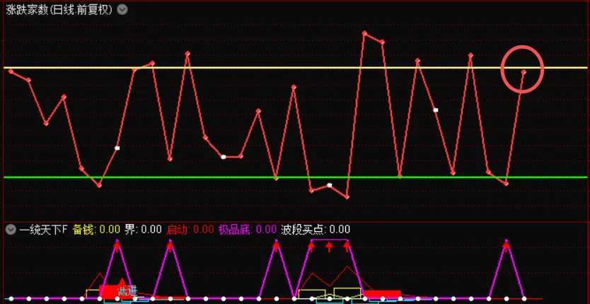 当涨跌家数下穿绿线的时候,表示冰点,可以适当低吸;