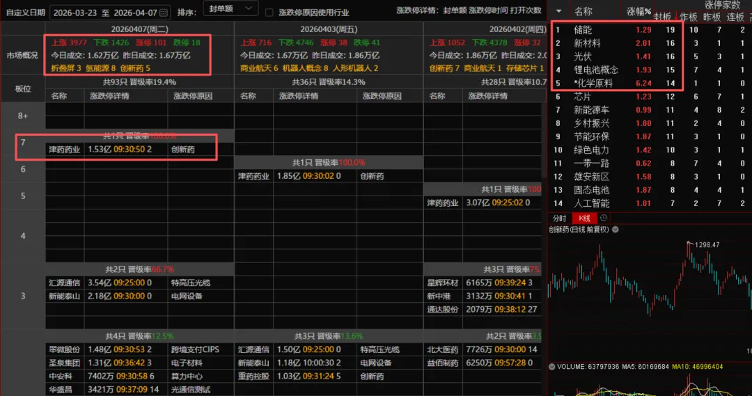 封板板块数量前5是为储能,新材料,光伏,锂电池,化学原料。