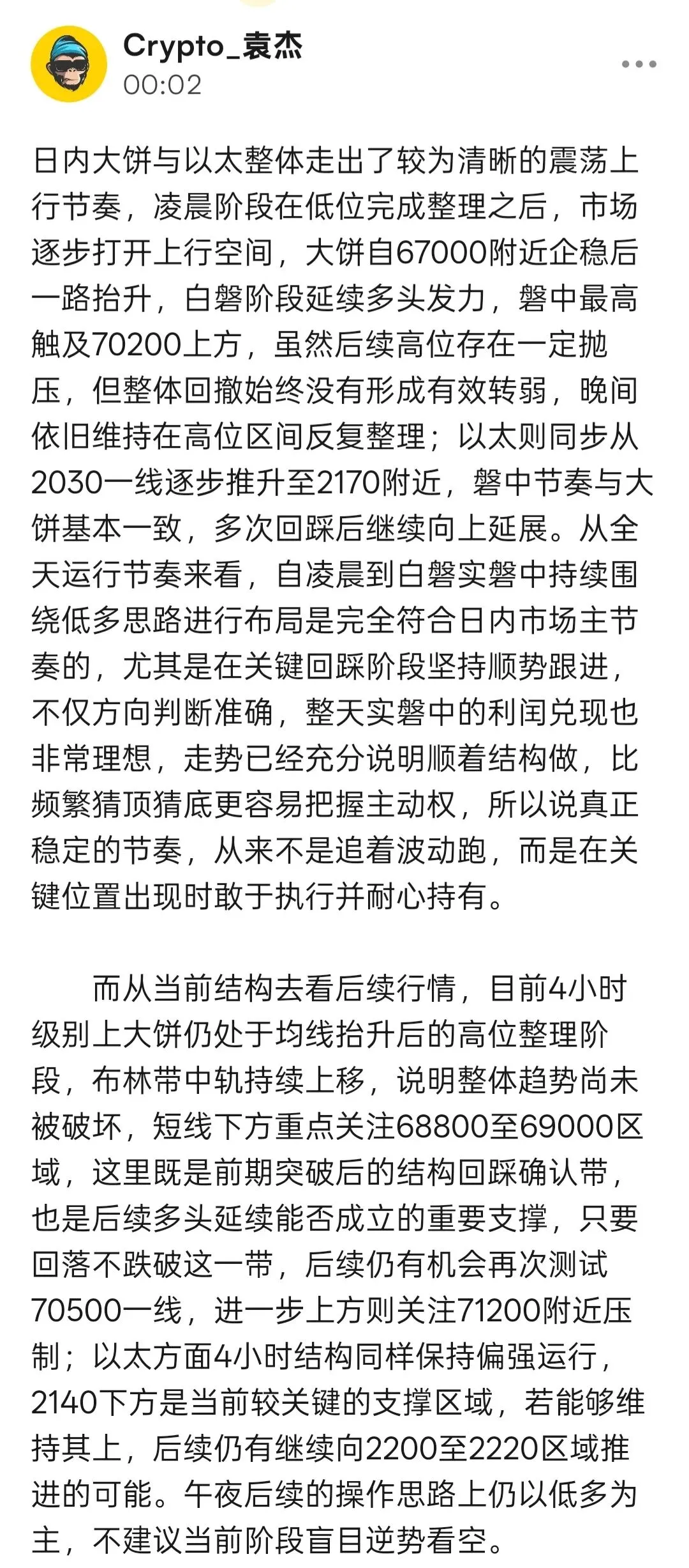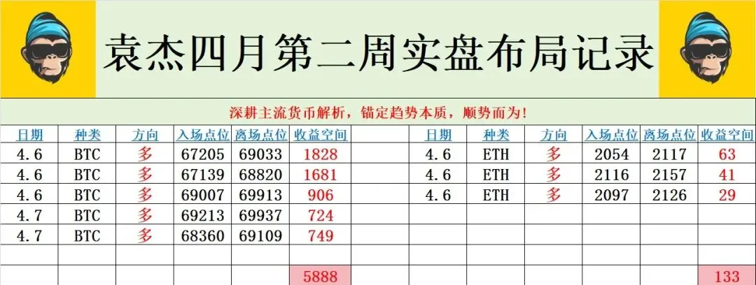 日内大饼与以太整体围绕高位承压后的区间震荡展开,大饼在凌晨阶段依托下方支撑逐步抬升,磐中一度向69200附近靠拢,以太同步测试2130一线,日内自凌晨到白磐的实盘布局也基本围绕低多思路展开,依托回踩后的支撑位置分批参与,期间低位承接表现尚可,走势基本符合预期。但在后续触及阶段高位后,多头并未形成持续放量,上方卖压开始逐步增强,随后行情重新进入整理,大饼晚间最低回踩至67710附近,以太最低下探2058一线,说明高位筹码松动后短线资金兑现意愿增强,不过低位附近依旧能够看到一定承接,行情暂时还未形成单边延续,而是在关键结构位附近持续进行反复换手。