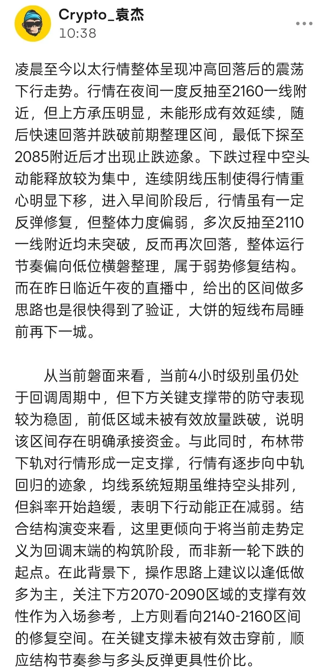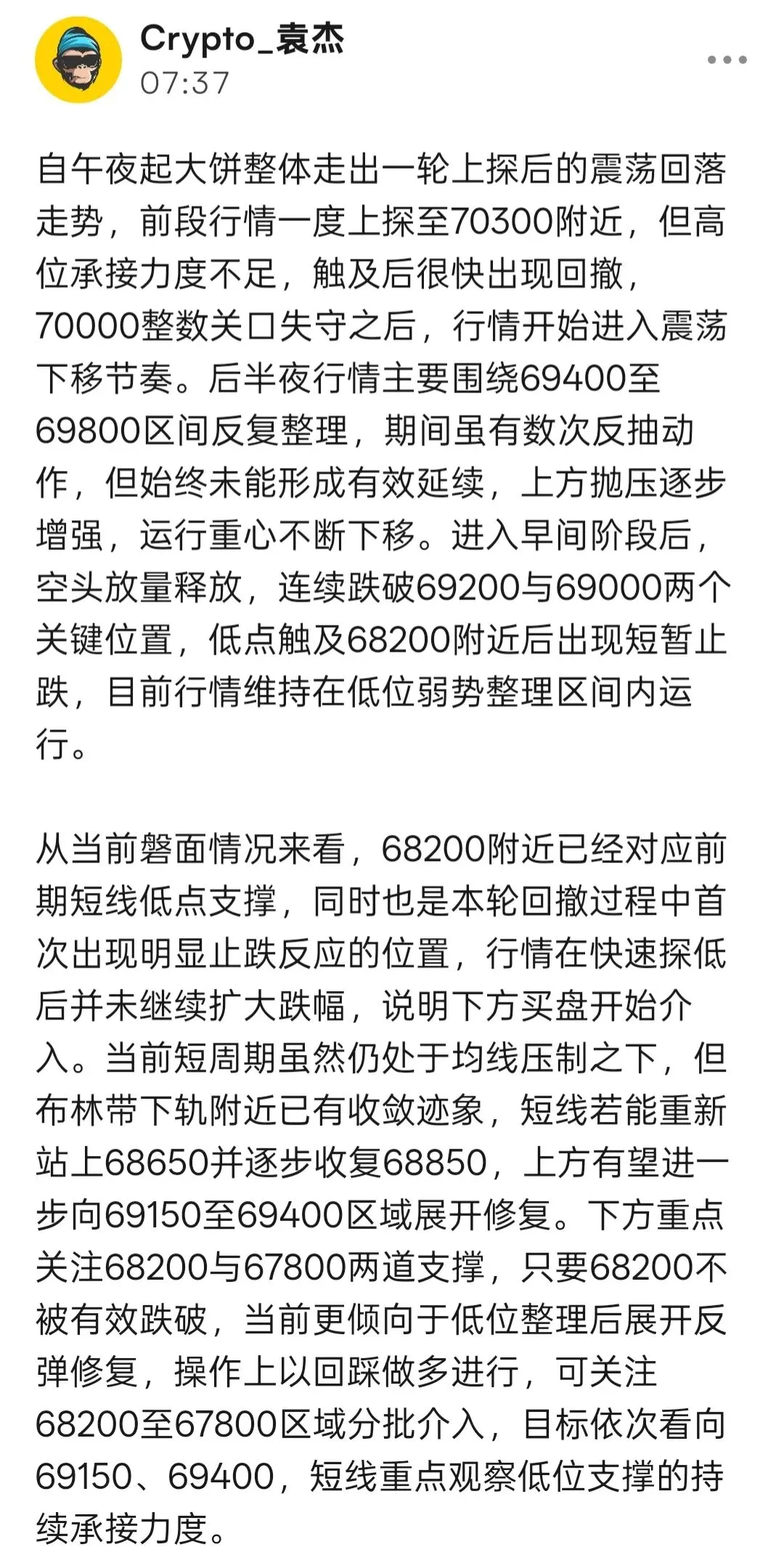 从当前4小时结构来看,大饼此前在69200附近形成阶段承压后,布林带上轨未能继续打开,行情重新回到中轨下方运行,中轨位置由此前支撑逐步转为短线压制,当前均线系统开始向下收拢,说明短线动能正在重新整理。尤其是前高未破后连续收出回落K线,高位形成的小级别压制已经较为清晰,后续若反弹不能重新站稳68600上方,整体仍难摆脱偏弱整理节奏,上方首要压制关注68600—68800区域,进一步强压仍看69200附近;下方则需要重点留意67500一线的承接力度,该位置既是前期回踩后的反复企稳区,也是当前短线结构中的第一道支撑,若失守则大概率继续向67000附近寻找更强承接。以太方面走势同步,大级别上2130承压后回落,4小时中轨失守后行情持续沿短周期均线下方运行,目前2095—2110区域形成明显压制带,若反弹无力突破,后续仍有继续向下测试2055及2035区域的可能。操作上现阶段思路保持明确,以反弹高空为主,不急于低位追空,等待行情进入压制区域后再顺势参与,更符合当前结构演变方向。