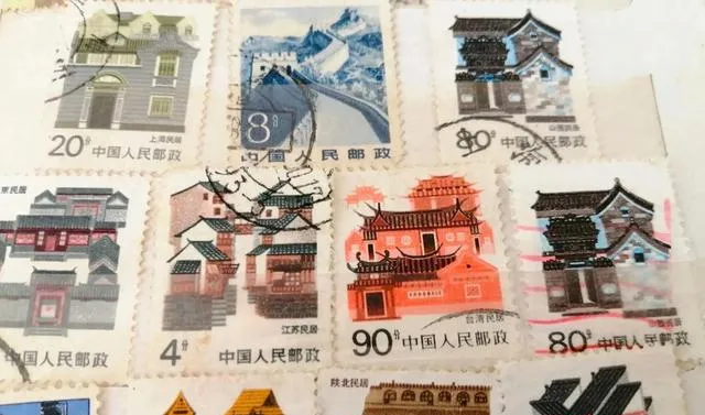 再看图中这些建筑票,属于地方风光混寄票系列,这阵子收的人多了,价格一下被带动起来,有常见的城市一景,也有江苏、北京、长城之类的经典场面,票面边有盖销章,印色各异,红砖青瓦看上去就是那个年代的老气息。