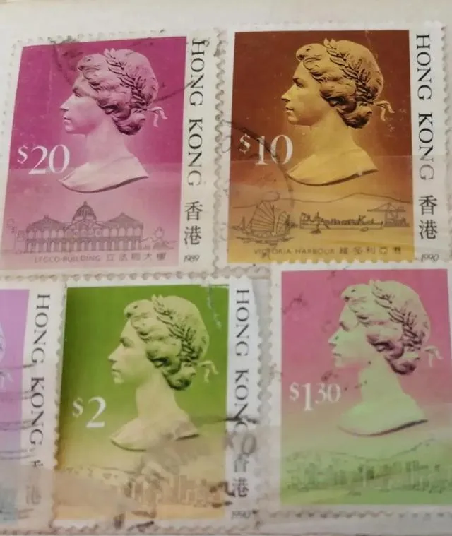 这些香港票其实在邮友圈子里是个分水岭,票面一律是女王头像,紫、黄、绿三色,底下画的建筑,现在看着也有年代感,这家伙在父亲书桌抽屉里一堆一堆全是,八九十年代通讯发达,家里亲戚捎礼老带几张,真没想到如今门槛越来越高,收集全套的价格蹭蹭往上涨。