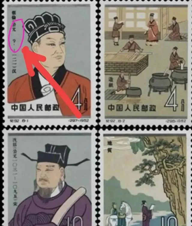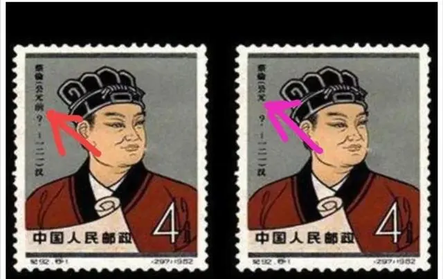 这张票就热闹了,纪92蔡伦错版票,眼尖的一下就能看出,票上的“前”字后头印了个问号,这在票界是个稀罕货,可遇不可求,这位蔡伦本来老老实实,硬是被印刷车间整出了个大新闻,几千张普通票里挑不出一枚,有人说这小问号问出了几十万的身价。