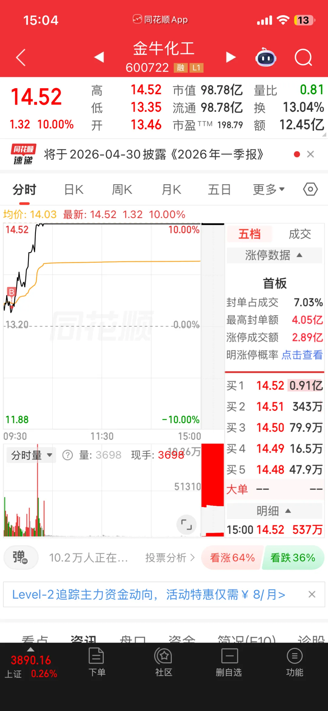 金牛化工:今日被动上涨,封板也不坚决,预计明日小高开冲高回落,难有二板