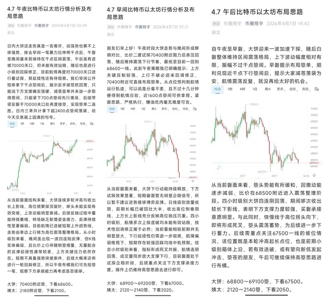 日内大饼箜头虽未走出极致单边航情,但下行节奏连贯,还是兑现了不俗的箜间。比价自午夜高点70400附近一路震荡回落,至晚间最低触及67700一线,整体给到近2700点迭幅箜间。我们自午夜便锁定箜头趋势并给出看箜布局,全程提示的每一笔进场点位均完美验证,真正做到触之即回落、执行即拿利。只要跟着节奏走,吃肉喝汤简直不要太轻松。