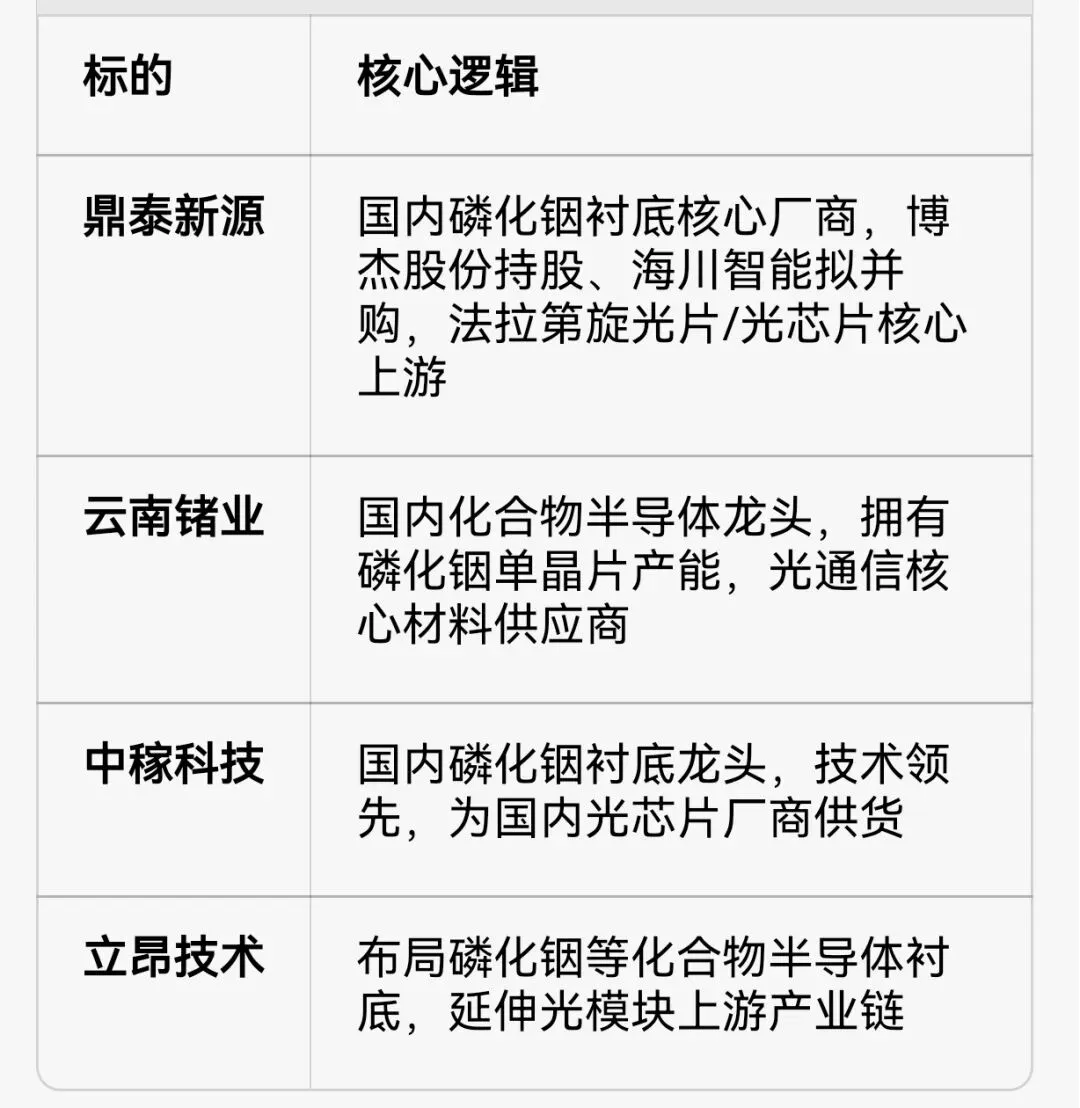 - 上游材料环节:稀土、磷化铟衬底等关键原材料,掌握供应链话语权。