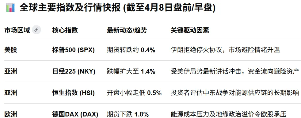 4月8日周三,全球股市因美伊冲突升级陷高度震荡。市场焦点集中在特朗普对伊朗设定“停火通牒”期限。以下针对各市场核心趋势分析: