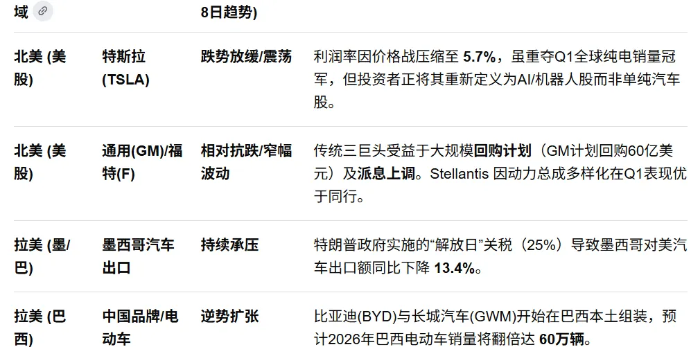 💡 策略建议: 美洲汽车市场处于“结构性洗牌期”。周三波动,建议规避过度依赖墨西哥跨境供应链零部件标的。关注巴西大规模基建投资品牌,通胀压力仍维持高现金流回购底特律巨头。