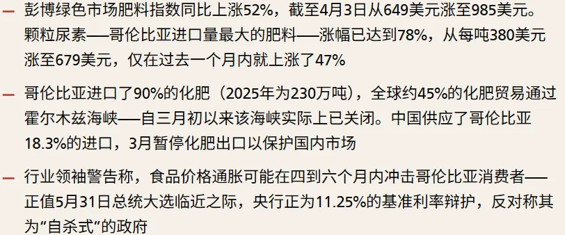 哥伦比亚化肥价格上涨52%,霍尔木兹关闭和出口禁令压缩食品链。(照源:复制品)