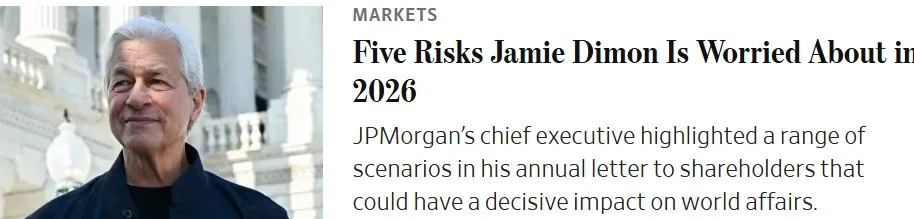 摩根大通首执官戴蒙(Dimon)年度股东信勾勒对全球局势产生决定性影响多重情境。伊朗战事、美民众信任流失、欧盟、初创企业同行竞争,AI对就业改造,是心头事。摩根大通公司(JPMorgan Chase)首执官戴蒙给股东年度信函,列出最大银行及整个系列风险