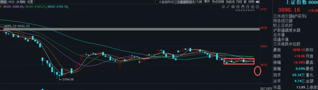 30分钟图里,昨日基本全天横盘。今天如果有冲高不重要,重要的是看回落的力度。下面画了一个红圈,我想了一刻钟也不知道该画长还是画短。画长了就是加速下跌,画短了就是背离那是止跌信号。所以不画了,一个圈表示一下。这里30分钟最低点3826,是在8点讲话后,外部环境极端情况下出现的低点。通常情况下,1、消息面没有干扰,今日上午有冲高,3929为高点;2、低点今日下探3965附近;3、今日已经进入季报、年报时间了。成长板块的业绩预喜会保持黄线的坚挺。今日黄线在上,那指数调整就调好了。风险提示:四月、五月是周线级别调整和止跌。外围有没有消息都是一个上下150点的震荡走势。放弃幻想,六月会是金色的。