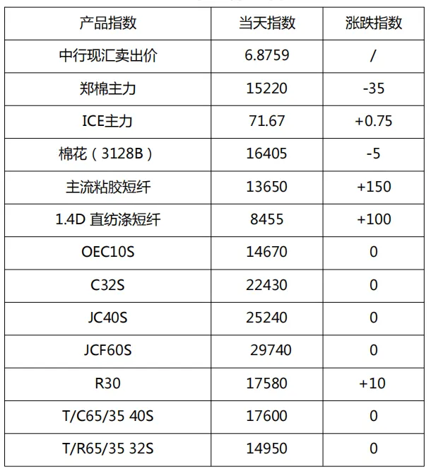 今日纯棉纱价格整体持稳,市场运行平稳。受郑棉高位震荡影响,内地纺企即期现金流持续较差,盈利情况持续走弱,市场心态偏谨慎,纺企顺价走货为主。当前阶段纺企陆续交付前期订单,整体库存水平偏低,原料采购随用随买为主。短期来看纱价偏稳运行。